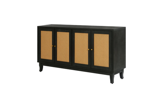 Handcrafted Premium Grain Panels Rattan Sideboard Buffer Cabinet Accent Storage Cabinet With 4 Rattan Doors BLACK